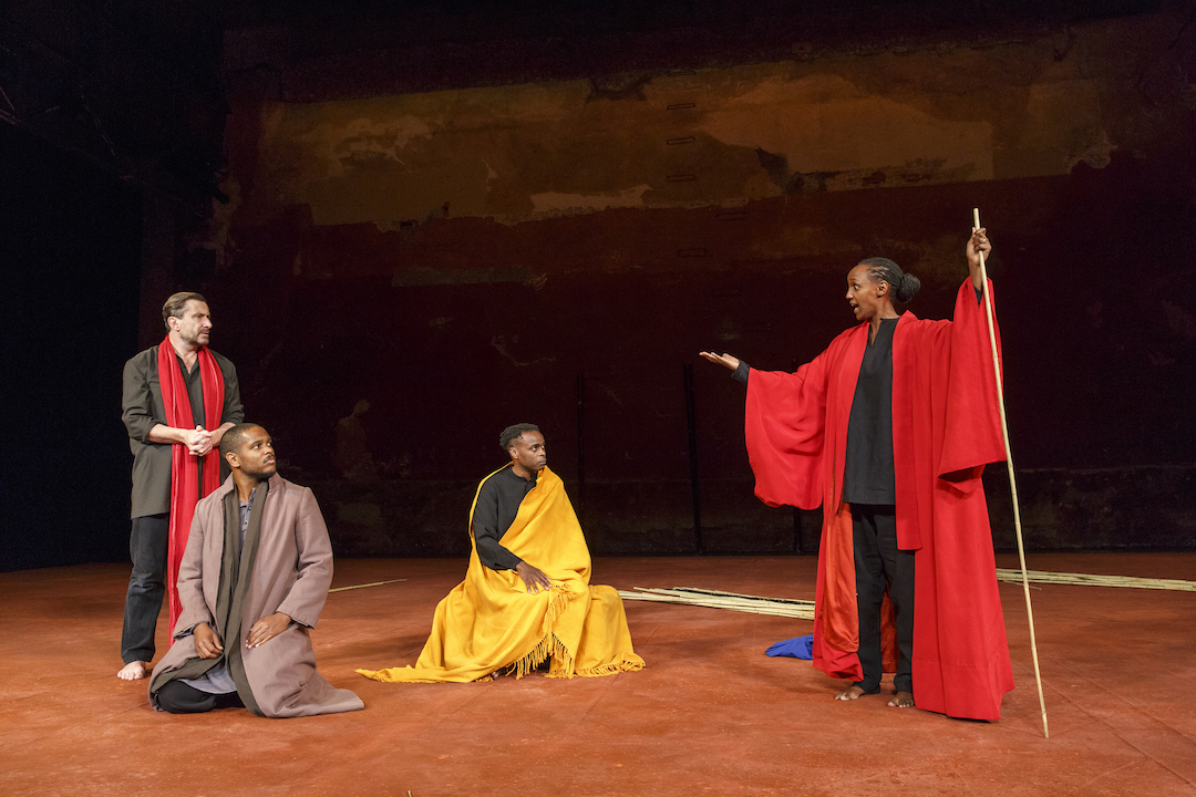 As Yudishtira struggles to face his destiny – how to rule after this apocalypse – he is enlightened by a series of parables told by his fellow actors (Sean O’Callaghan, Carole Karemera, and Ery Nzaramba) playing a number of roles. There are allegories of pigeons and worms, of dead children emerging from a river and returning to it again. These ancient stories are enacted by these barefoot players with a few colored robes that become a river, then a shroud, then a golden garment, and so on. It’s what theorist Brook calls “holy theatre – or the invisible made visible”.