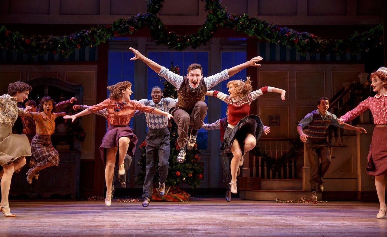 With Irving Berlin as composer and lyricist, Holiday Inn has nothing to worry about in the music department. Roughly half of the songs come from the movie, which had fewer songs in total. Classics like “White Christmas,” “Blue Skies,” and “Cheek to Cheek,” are rolled out one after the other. Musical numbers are all sharp and spirited. “Shaking the Blues Away” is probably the most exuberant. Its rousing tap dancing is complemented by jumping rope, with dancers doing both at the same time. Corbin Bleu deftly taps the blues away, supported by a very talented company.