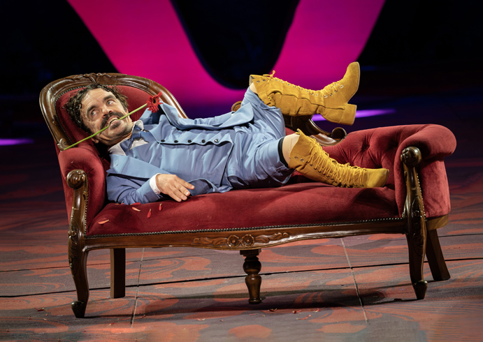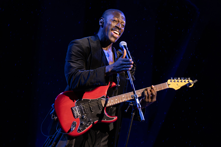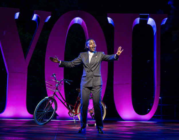 Feste, a Fool with electric guitar and Soho designer clothing, winds his way through the plot commenting and singing. “Better a witty fool than a foolish wit.” In his stage debut, Moses Sumney moves like a dancer, acts mercurially, and has a beautiful singing voice that rises to high tenor, but is sometimes vocally unintelligible.