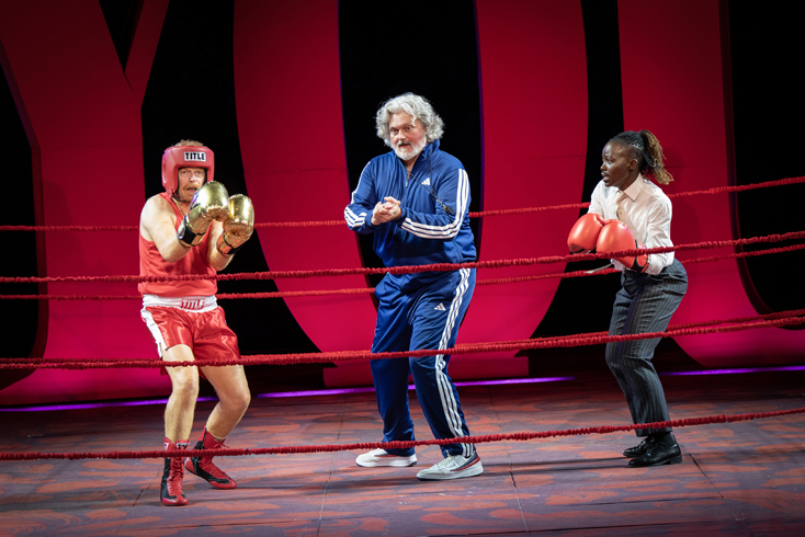 Clever conjuring of a boxing ring finds Andrew in colorful silks and Maria outfitted like a tacky Wrestle Mania score keeper. Conspirators “hide behind” three foot, three dimensional letters T R E E. The only permanent set piece is enormous spelling out of WHAT YOU WILL (The play’s full title is Twelfth Night, or What You Will.)