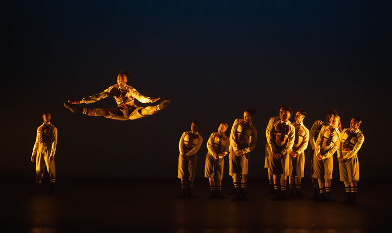 Voices rise, talking over one another. We’re at a school or institution. Projection of enormous windows creates scale. The company wears contemporary, trend-interpreted uniforms with cut-out shirts, ties, wide, cropped pants, and socks. (Katie Chihaby) Moving in unison, regimentation reigns. Floor work, frequent in all the new pieces, is lengthy and imaginative. ‘Students’ arch, roll, kick, extend, turn, flatten, spin, undulate. They rhythmically clap and slap their thighs. Arms shoot up. Hip hop moves and vocal rap combine.