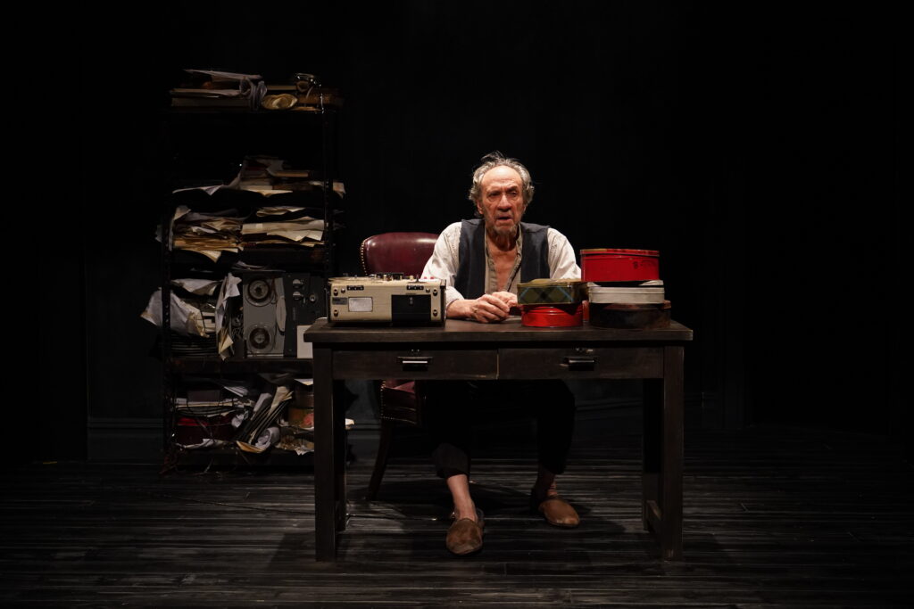 As the pièce de résistance of the evening, Krapps’s Last Tape, one of the most performed and celebrated of Beckett’s one-acts, stars the inimitable F. Murray Abraham. Abraham gives a bravura performance as the lonely and isolated elderly Krapp, who replays a tape recording of himself at a younger age, then records himself in the present day. Krapp’s abode is as scruffily arranged as his personal “style,” superbly conveyed by Charlie Corcoran’s scenic design and Orla Long’s costume design. Once again for Krapp’s Last Tape, O’Reilly assiduously follows Beckett’s stage directions.
