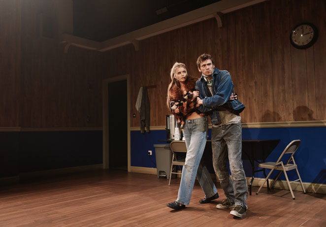 Stage blackouts define every vignette. Time passes. “I’ve been looking for you since I got kicked out of college,” he tells her. “Can we just start again?” she responds, deflecting. They concoct elaborate new identities and go to a bar. Suddenly, he’s spitting (effectively manifest) blood. She wants to take him to a hospital. He won’t go, sure the institution won’t let him leave.