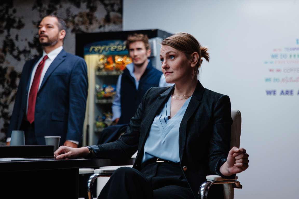 The play, well directed by Max Hunter on a small spare set, takes place in an office. Three co-workers gather to await their boss, who is going to “cull” one of them as part of a corporate restructuring aimed at boosting the bottom line.