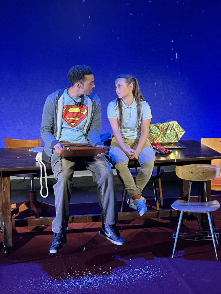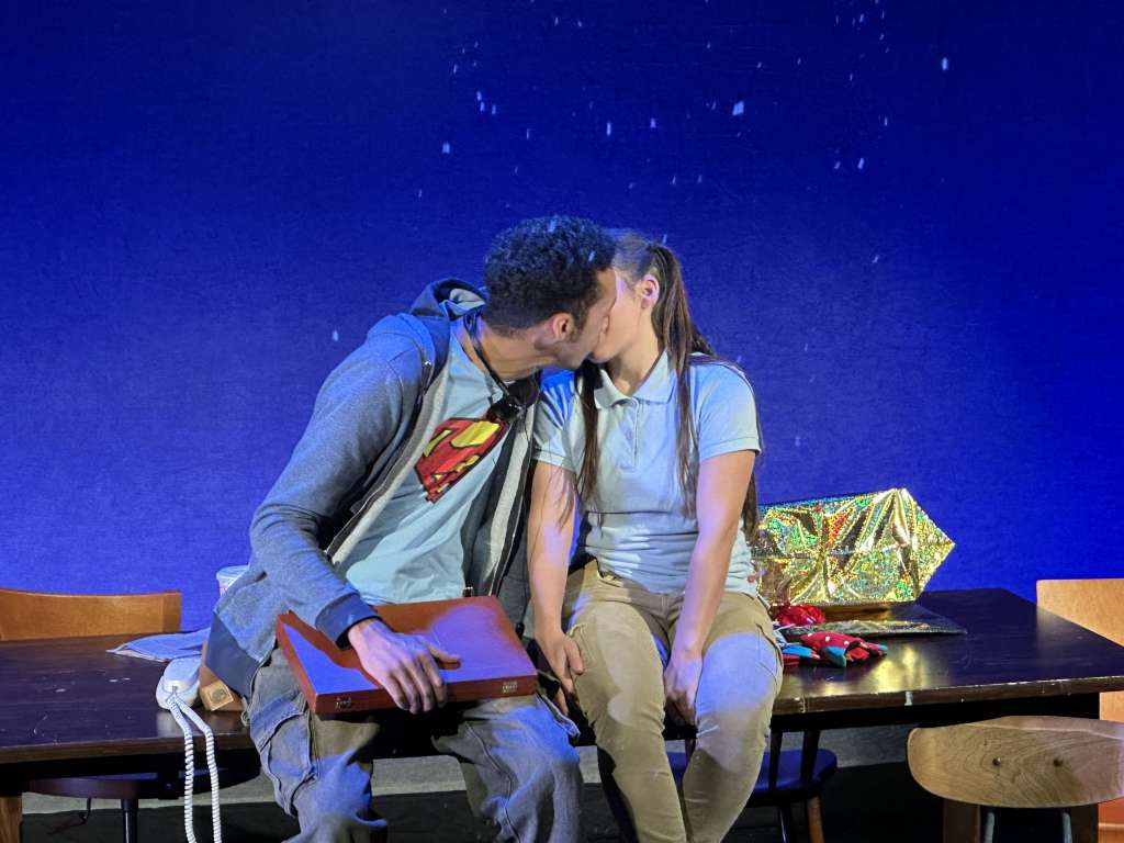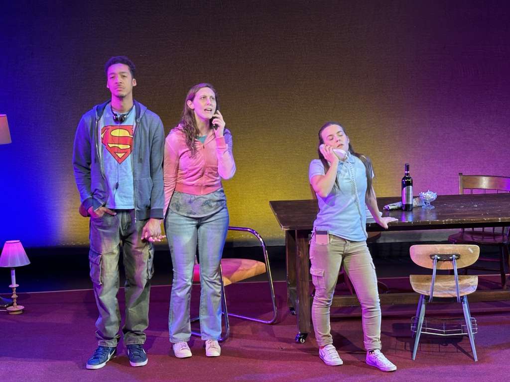 In other words, “If We Kiss” is more realistic then most romcom cliches– even as it speeds toward a happy ending, it careens through the genuine ups-and-downs of adolescent emotions. Rachel Vail adapted her own YA novel into this play, shifting from a darker tone about jealousy among teen girlfriends to one that deftly combines teen sarcasm, sweet silliness and nuanced conversations between adults and teens about love and relationships. (The jealousy is still there but reduced to a secondary role.)