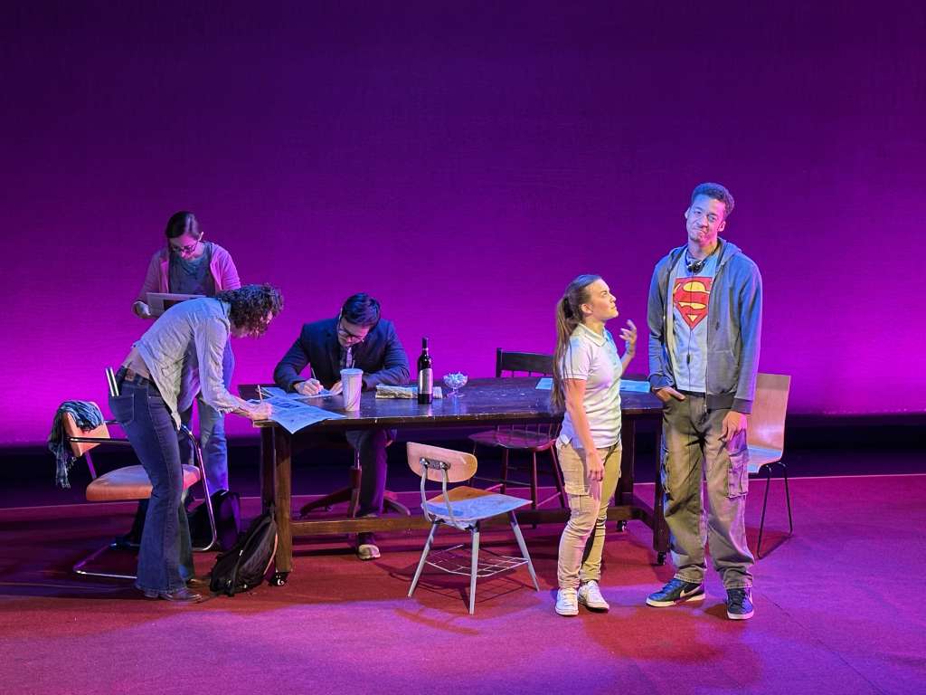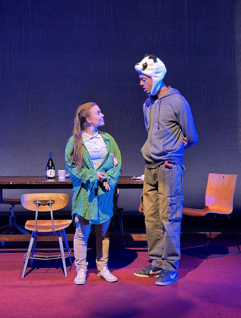 As you can see from the repeating cast names, the play gets a lot from its small cast, who often switch roles just by adding a hat or peeling away a layer and changing their body language. This allows Kevin and George to somehow be in the same scene even though Bellow is playing both roles. This kind of creative theatricality gives a “putting on a show” sense of fun without ever feeling like it’s being done for its own sake.