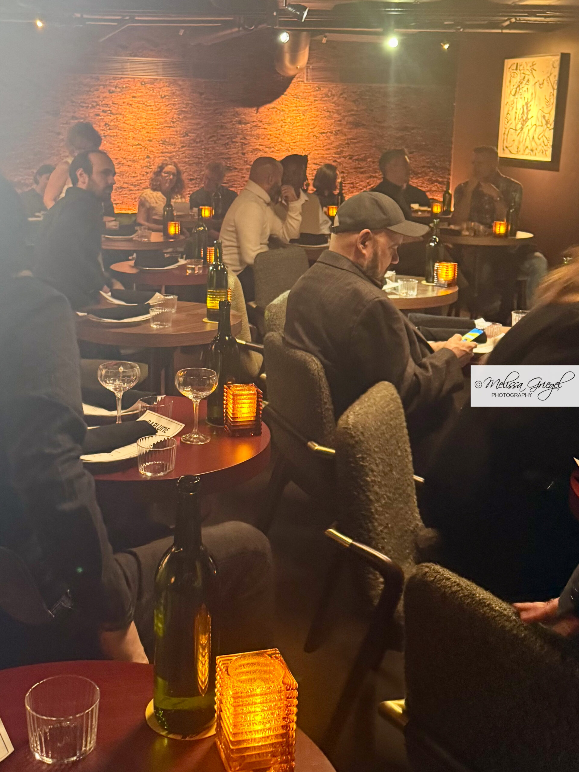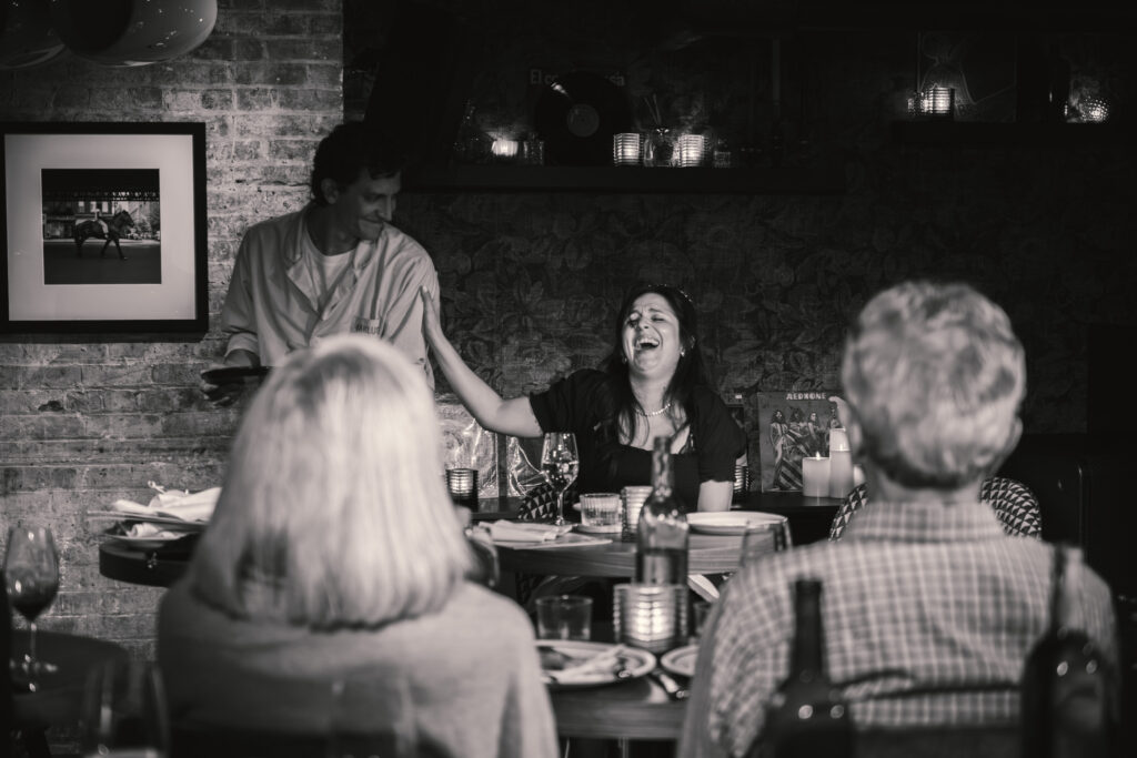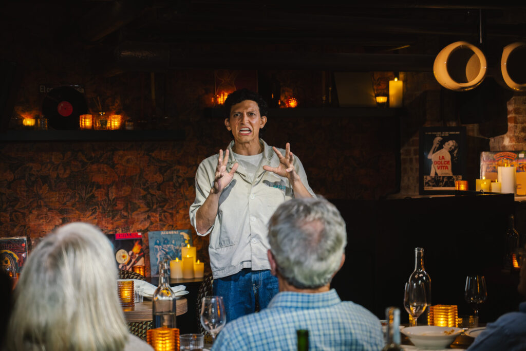 We did have a tech in the space to light it, and give the actors a chance to work in it. But the restaurant did a great job of diving in, under fire. We did have a chance to do this show once with Barlume before this run, and we discovered a lot then, as we will every night. There was a learning curve for the restaurant, but once they saw it happen once, they really understood the timing with the plays and when to fire courses. We also discovered it was appropriate for there to be service during Frank’s monologues. Since I was a waiter, leaning into the real life restaurant aspect worked and helped move things along. Before the show, the bartender asked when he could shake cocktails. I told him not to do it during the plays, so as not to distract, but that during my monologues he could go for it, and if it ever got too loud, I would just talk louder. It’s a real restaurant, not a theater, and embracing that is the key. We are given permission to not take ourselves so seriously. It’s a chance for everyone to let their hair down and relax the idea of how they think a play or a meal should be presented.