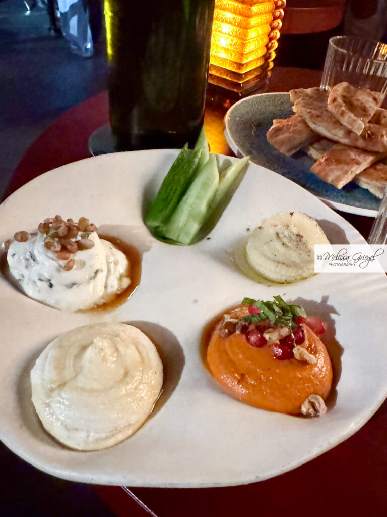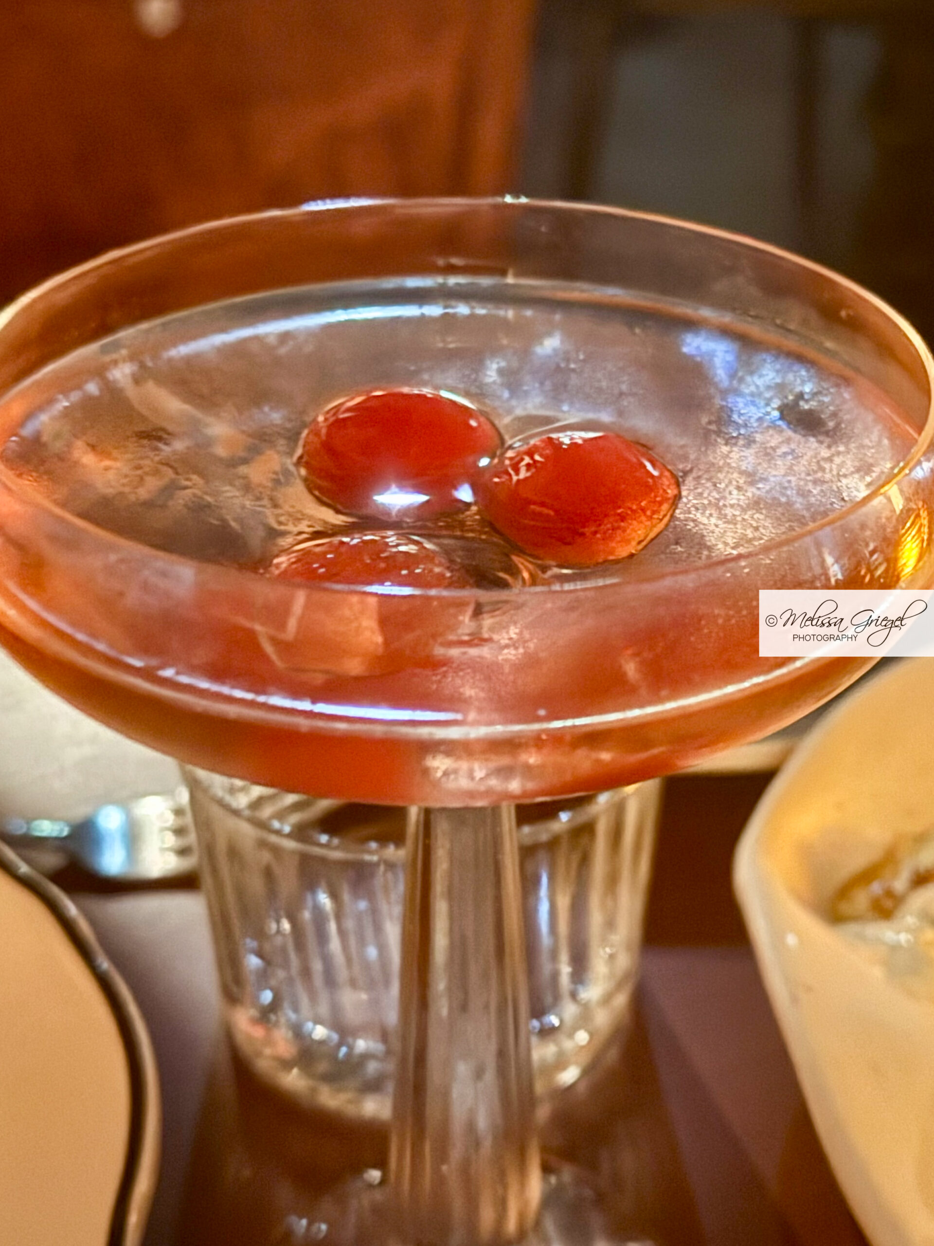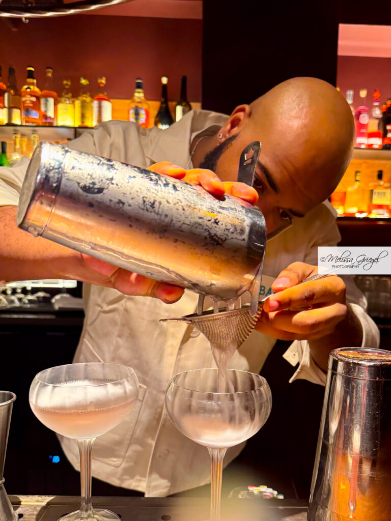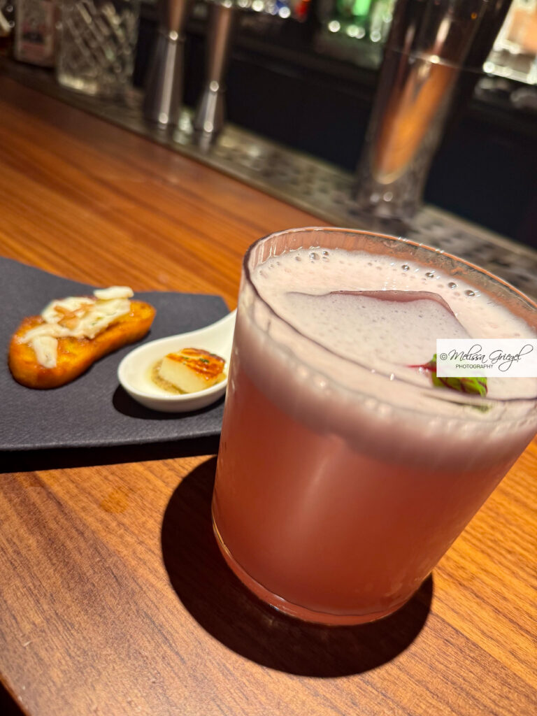 The evening begins in the bar area where you have time to roam around, chat with people, and order specialty cocktails while delicious canapes are being served. The $165 ticket price for the show includes four courses (three types of canapes, a four-spread sampler with toasted flat bread appetizer, a choice of chicken, pasta, or steak for your main, and tiramisu for dessert); drinks are extra. Every course was delicious and well-presented and the drinks were as beautiful as they were tasty.