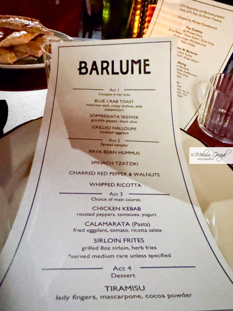 d’Amato: We didn’t have any input on the menu. While Michael Domitrovich is a super talented chef, and we would love to have input on the menu in the future, this time it was more fun to let Barlume do their thing. We adapted creatively around what they were already serving. The beautiful aspect of this event is how flexible it can be. When we did Pop Up Dinner Theater the first time at a different restaurant, we had regular meetings with the chef and the food was even more tied into the stories, but it’s not necessary. Again that’s the beauty of this event, we can take what you serve and make it theatrical.