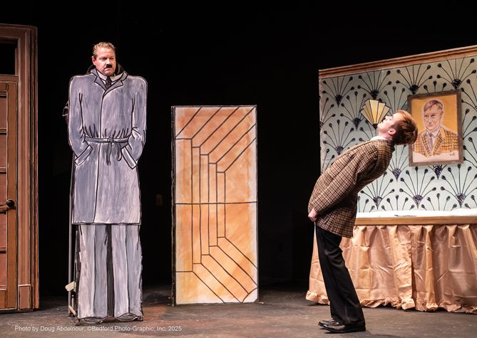 Our tale plays out on a splendid set of mostly one-dimensional cut-outs including a roadster, bathtub, bicycle, and rotating library/bedroom which are charmingly sketched and painted. (The bed could be more recognizable as such.) Ersatz fascist/interfering antagonist, Roderick Spode’s extreme height, assisted by increasingly tall stools, finally settles on a tall, headless cardboard figure behind which the actor Mark Edward Lang stands on a stepladder. Isabelle Favette – Scenic Artist/Set Design.