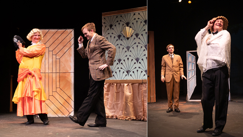 We meet Bertie (Will DeVary) listening to wonderful 1930s music in fact written by director Owen Thompson’s grandfather. There’s no fourth wall. The story is both told to us and enacted with the hero’s obtuse, ingenuous appeal. He conscripts Jeeves (Jason Guy) to play himself. The mercurial Guy also inhabits Stephanie “Stiffy” Bing, twittery Gussie Fink-Nottle researcher of newts and intermittent fiancé, and Madeline’s pompous father, Sir Watlyn Basset.