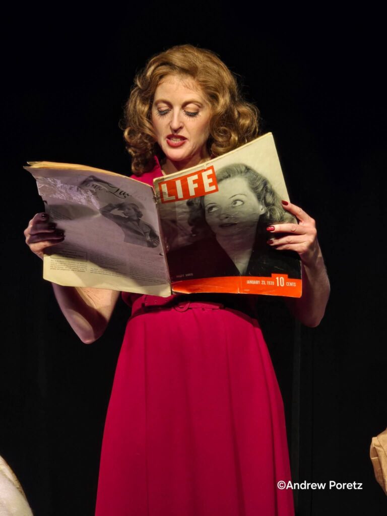 Especially striking was her use of an actual Life magazine prop featuring Davis on the cover, their visages similar enough to think Davis herself was holding it up. In a wonderful touch, Sherr used a scarf, gloves, and earrings worn by Bette Davis that were gifted to her by the Davis estate. Sherr makes clever use of her set, a somewhat fancy “dressing room” or living room that utilizes a small table, a sofa, a coat rack, and props that include a pair of Oscars, a carafe of “liqueur” for several drinks she poured for herself, and an antique phone, used for the many “phone calls” from deliciously dropped names. (In larger theaters, Sherr uses a fully dressed set that recreates Davis’s Hollywood home.)