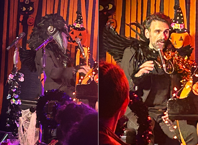 The Laurie Beechman stage is gleefully ungapatchka: wildly ornate, ridiculously over-decorated. ‘Patriarch’ Joe Iconis appears wearing a fabulous raven head and wings created by actor Lauren Marcus. This year, the artist is trick-or- treating as a bird from Alfred Hitchcock’s The Birds, his wife Lauren as star of the film, Tippi Hedren, 1 ½ year old Roxy as Alfred Hitchcock. No kidding. Usually & Family shows are comprised of original Iconis material. Tonight, a few are his, the rest “Halloween adjacent cover songs.”