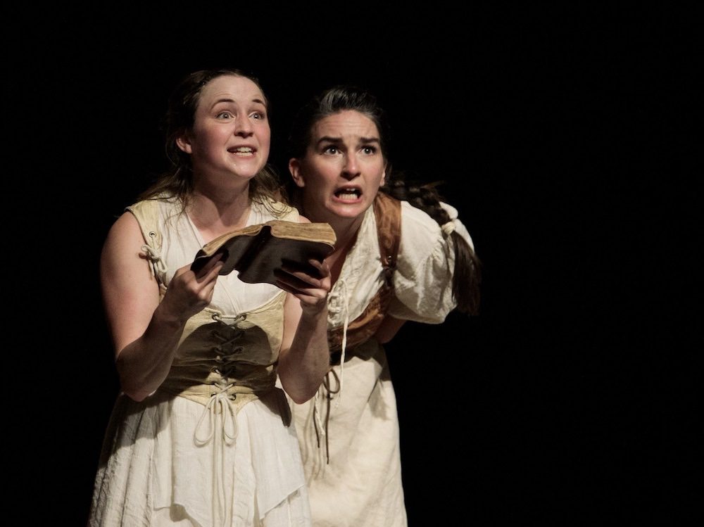 The three-person cast—Lili Beaudoin as Juliet, Ryan Gladstone as Witches, Nurses, Prospero, and Shakespeare, and Carly Pokoradi as the approximately 20 other characters—was delightful, joyful, and funny. Pokoradi was extraordinary. She used unique voices, gestures, and postures so that the audience could easily identify the character speaking—no small task given the speed of the dialogue towards the end of the play, with the five heroines on stage simultaneously.