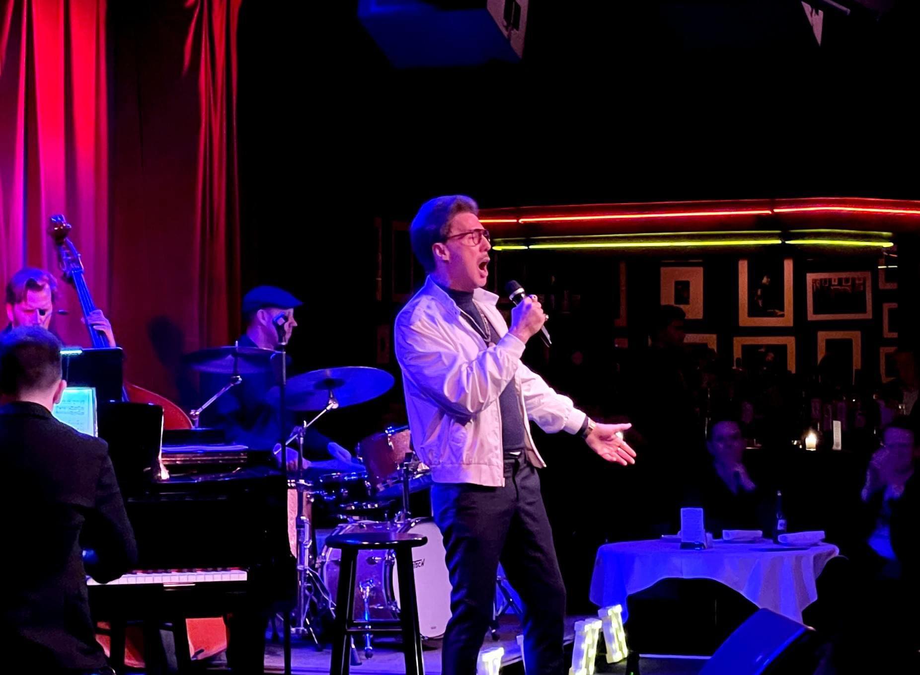 For this sold-out show upstairs at Birdland, he put a fun twist on that concept. It was announced that Kenn was not ready, and Michael West was called to the stage. Michael, wearing a conservative outfit, sang “This is my day…” before being interrupted by the announcement that “Kenn” was ready. Michael left the stage, the band vamped for a couple of minutes, and Kenn Boisinger came out singing, now in a loud, “Vegas” dinner jacket and his “Kenn” wig. (Later in the show, he changed to a white Members Only jacket.)