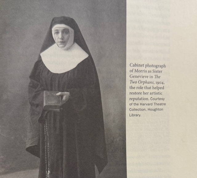 Once a household name, especially in the 1870s and 1880s, but now largely forgotten except among theatre historians, she’s the subject of a thoroughly well-researched, expertly written biography of Morris (1848-1925), published 16 years ago by Barbara Wallace Grossman, Professor of Theatre at Tufts University. Morris, whose later years saw her turn from acting to writing, published three memoirs, but none tell her story with the kind of comprehensive detail and analytical insight brought to the task by Grossman. Morris also kept a 54-volume diary covering 1868-1924. Despite significant lacunae it forms an extremely valuable resource in Grossman’s reporting, as does the unpublished research of an earlier researcher, George T. MacAdams, who left it behind on his death in 1929.