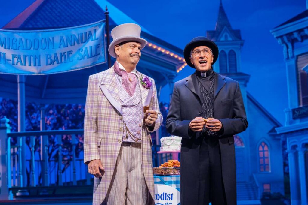 The score of Schmigadoon! is one of the production’s smartest pleasures, creating brand-new songs that feel lovingly borrowed from Broadway history. Rather than copying classics outright, the music captures the style, structure, and spirit of beloved Golden Age composers so accurately that many numbers sound instantly familiar. You may feel as if you know them already, even on first listen. “Tribulation,” a comic patter number, races with the same breathless energy and rhythmic wordplay that made “Ya Got Trouble” from The Music Man iconic. “Baby Talk” affectionately mirrors the bright instructional bounce of “Do-Re-Mi” from The Sound of Music, while gleefully pushing the innocence into more adult territory.