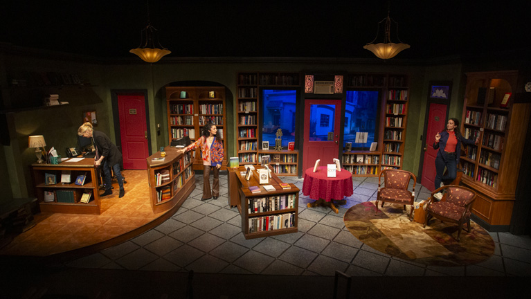Cozy and woody, Jessica Parks’ set design appealingly looks like it comes from another era. All the books (spines) we see are relatively current, none mass market. Gates open and close the shop at the start and finish of the story.