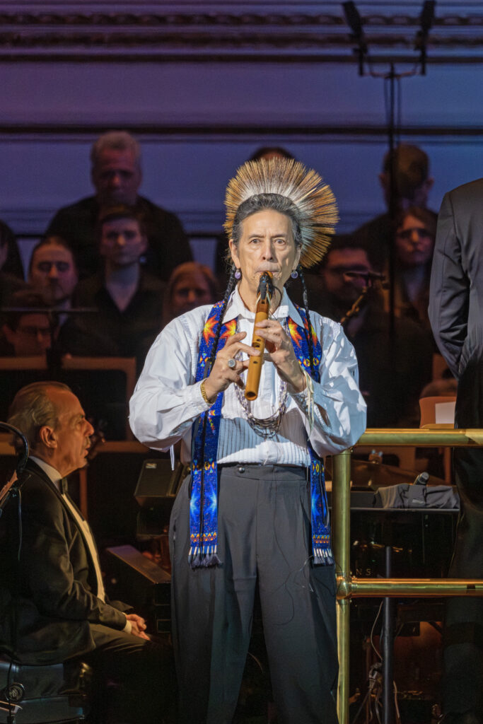 To set the tone, the evening opened with a musician named Tchin, playing an Indigenous American courting flute, unaccompanied, and wearing a traditional headdress. It had the feeling of a ceremonial invocation. Rather than a standard overture, the orchestra, joined by EVUSA, followed with “Chester,” from New England Triptych, based on the 1770 hymn by William Billings.
