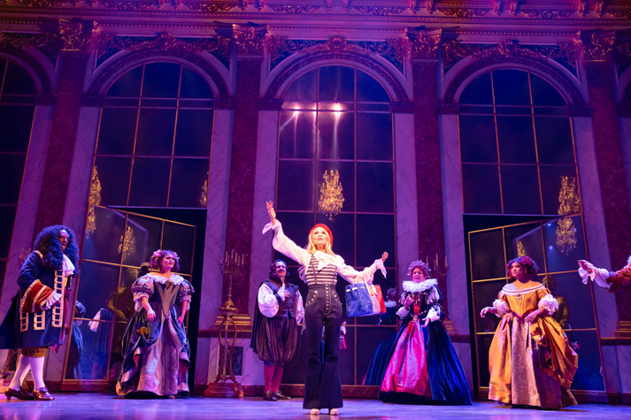 One can imagine the reasoning behind framing the musical with Louis XIV’s profligate court, but the novelty is poorly integrated. (Pablo David Laucerica, enacts a splendid, gleeful king). The same can be said for a giant television screen, eventually depicting Jackie’s self-branding. Oddly, cameras and large microphones indicating documentary filming don’t get in the way.