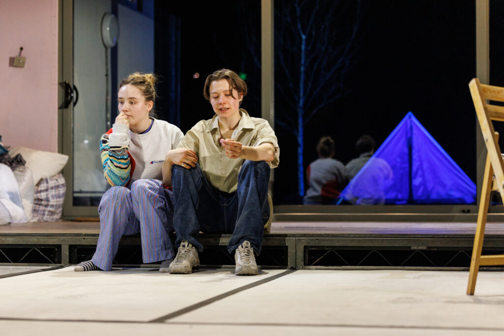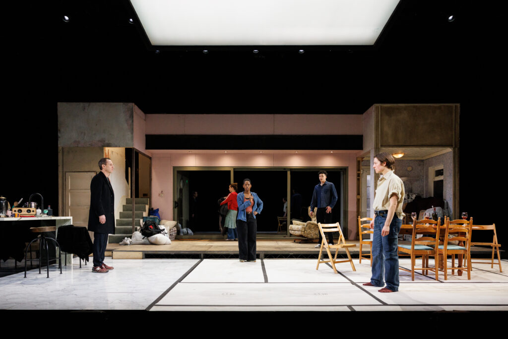 A web of family secrets lurks in the shadows of Rosanna Vize’s set design (she also provides the costumes), that features a home under construction. A white light box hovers overhead that shifts and turns to… well, shed light on things (overall, James Farncombe’s lighting design shows a deft touch). The story of Oedipus is one of incest and expulsion, so it’s not that much of a spoiler to say that Menzie’s Uncle Chris and D’Arcy’s Annie—his wayward niece—are not right from the start. Having moved into his brother’s home a few years earlier after his suicide on the premises, Chris also became responsible for both Annie and her younger sister, Issy (Ruby Stokes). The family home built by his grandfather is now Chris’s, where he’s living with his new wife, Erica (Lorna Brown) and her teenage son, Leni (Lee Braithwaite). It is the decision to finally spread his brother’s ashes that leads to the estranged Annie coming back to the house that was once hers which has now been taken over by her uncle and his girlfriend. Unhappy with the massive renovations going on, even though she’s been away for some time, Annie returns as one unhappy camper.