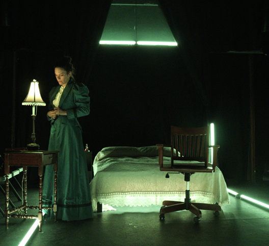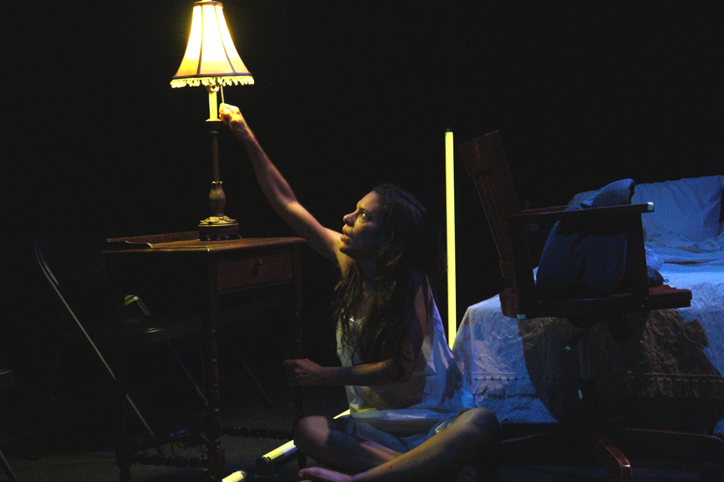 Joe Sinkovits (Sound Design) and Hunter Lustberg (Lighting Design) work symbiotically to create disturbing atmosphere coordinated with the heroine’s mercurial state.