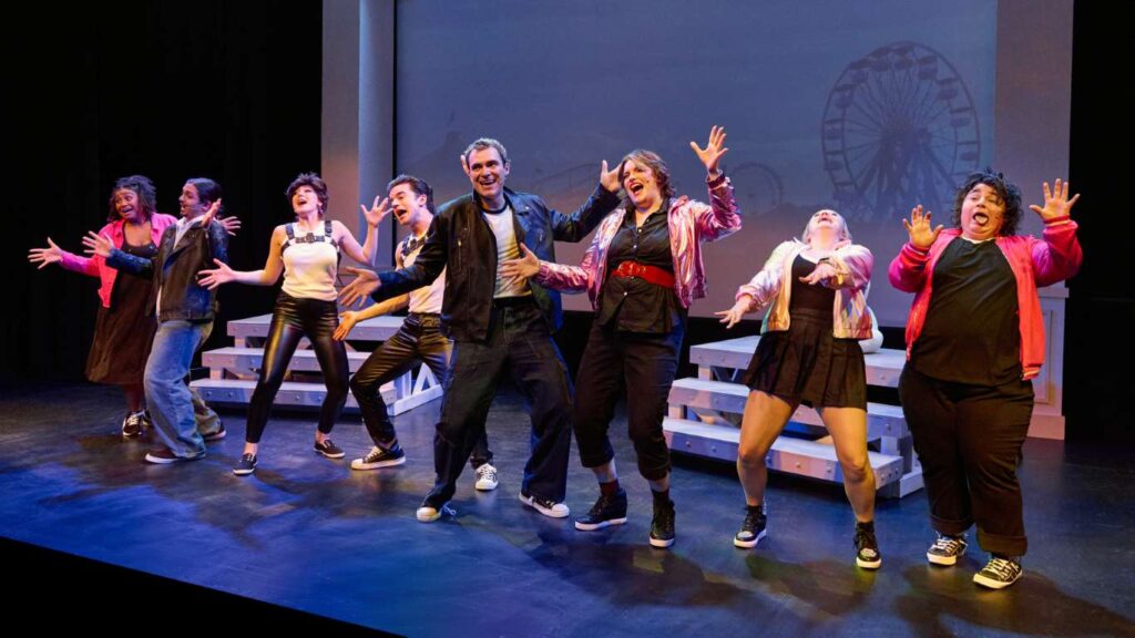 While the set is minimal – a projection screen and a few props – the vocal performances are anything but. Vape! repurposes Grease’s songs with gleefully twisted lyrics. Notable among the leads are Scott Silagy as Danny, Lara Strong as Sandy, and Slee as Rizzo, with solid turns from the rest of the cast.
